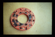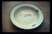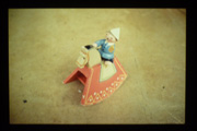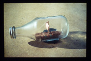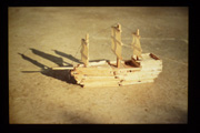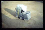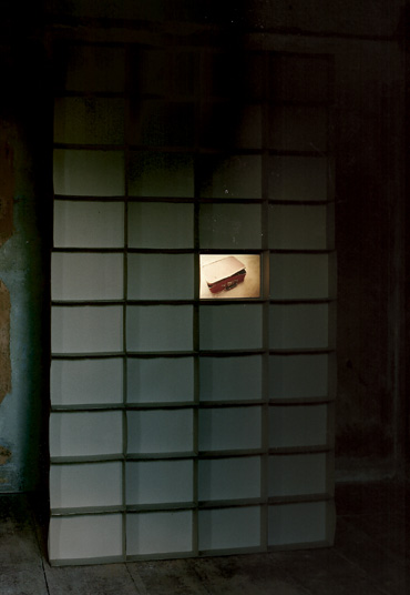 Rauminstallation: Regalsystem aus Faltkartons mit rückseitiger Diaprojektion (2m x 0,9m) Die Dias zeigen Kinderbastel-arbeiten, Spielzeuge und Alltagsgegenstände aus dem elterlichen Nachlaß