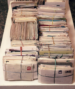 Installation mit Dokumenten aus 150 Jahren Familiengeschichte der Künstlerin. Zu festgelegten Archivsprechzeiten waren die Ausstellungsbesucher eingeladen, den Prozeß des Sichtens, Auswertens und Archivierens des umfangreichen Materials in Form von Fotos, Briefen, Urkunden, Notizen, Kriegstagebüchern, Feldpost etc. zu begleiten.