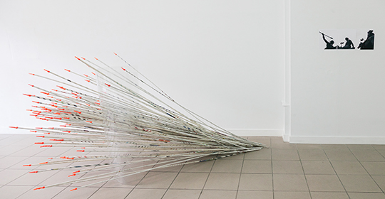 und Louis Tuaillon (1895/1904) sind Bronzestandbilder in vollendeter Antikenästhetik, die junge Reiterinnen im leichten Gewand stolz und souverän, aber auch mit großer Angriffslust zeigen. In meiner fotografischen Annäherung stelle ich insbesondere die Waffen mit denen die Amazonenstatuen ausgestattet sind heraus: Streitaxt und Speer. Kämpferisches Potential läßt auch die Installation anmuten, wenn die Pfeile dynamisch den Raum zu erobern scheinen.